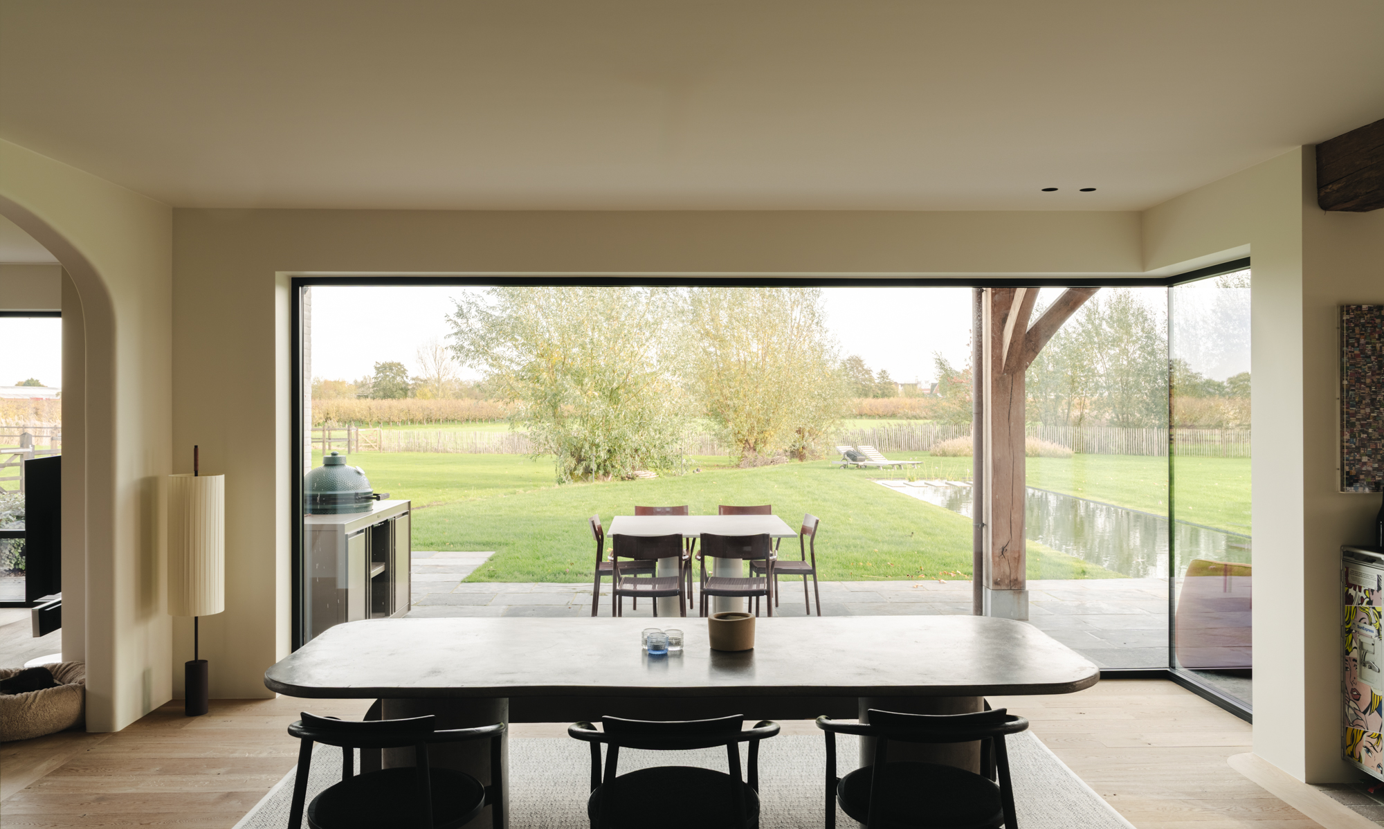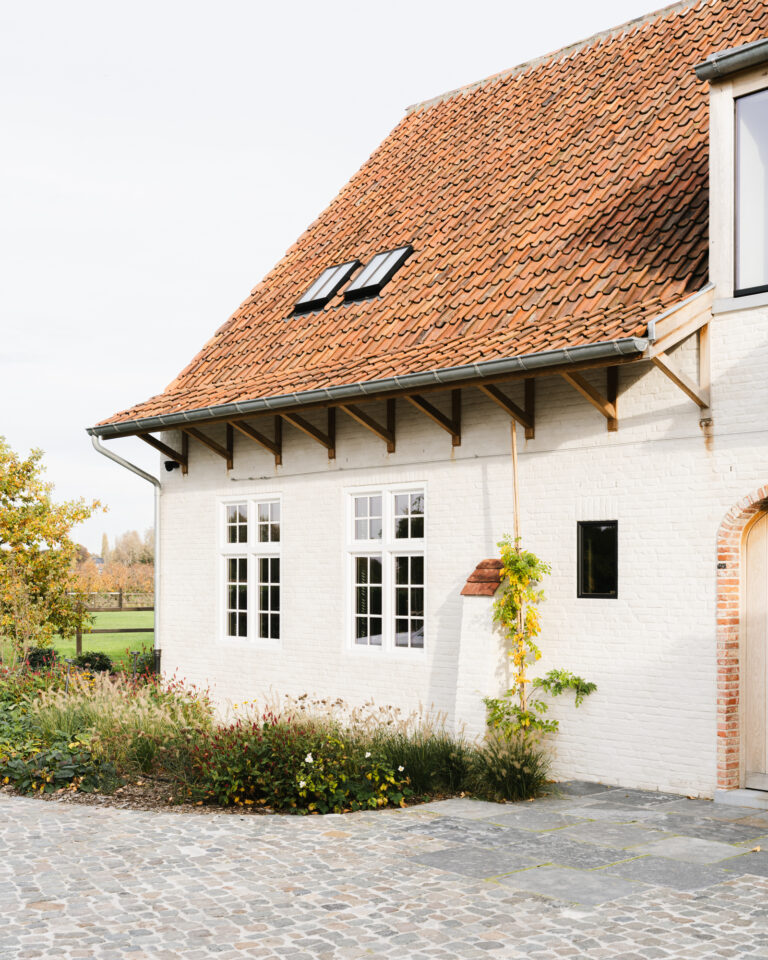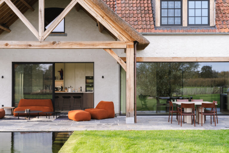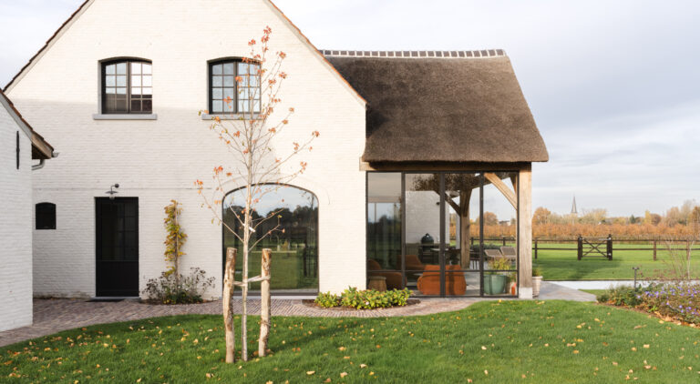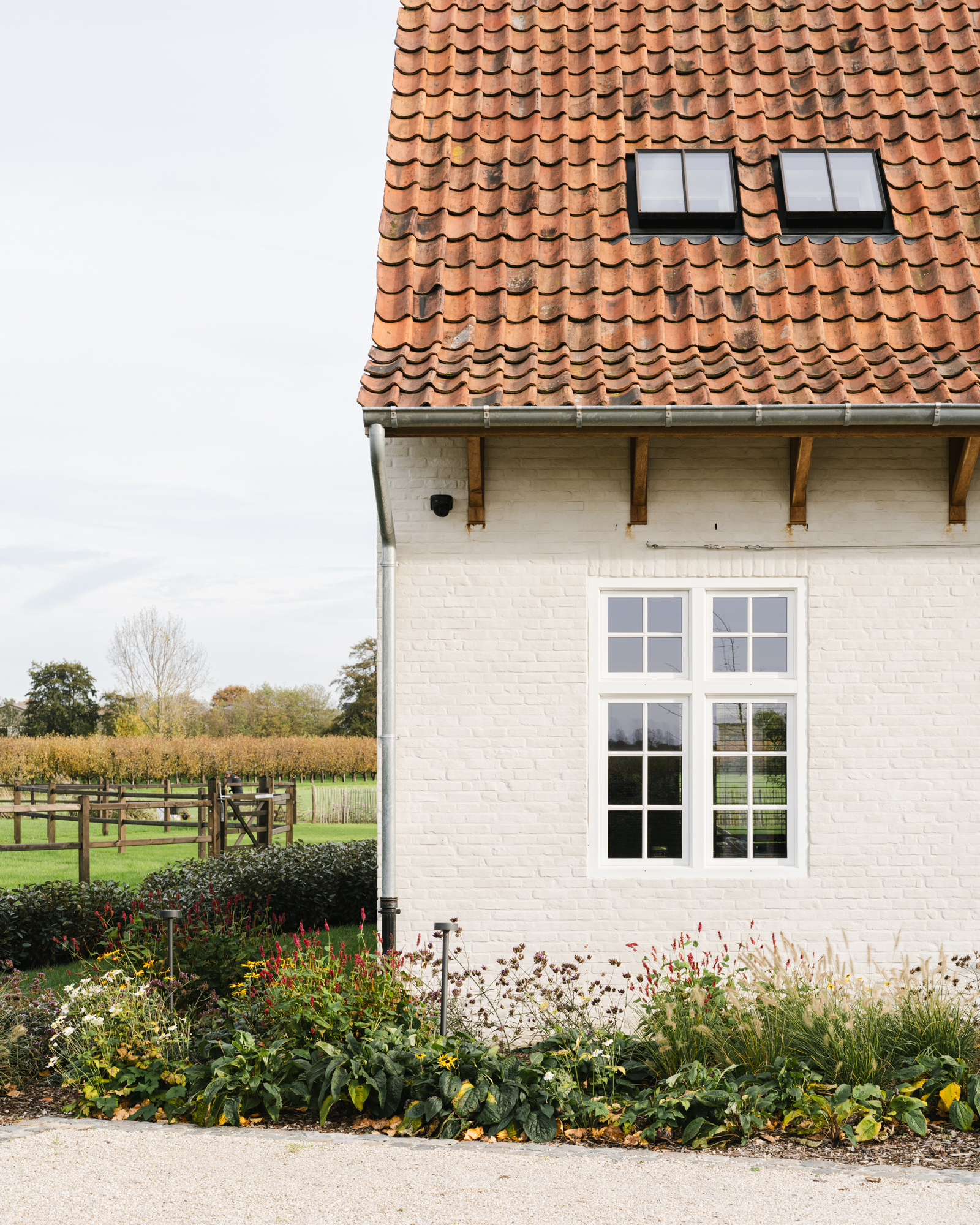 "De combinatie van materialen en kleuren geeft onze hoeve een unieke uitstraling. Voor de voorzijde kozen we bewust voor witte ramen met glasverdeling en een warme eiken deur om de authentieke sfeer te behouden. Achteraan genieten we volop van de grote raampartijen met een schuifraam en een prachtig boograam. Dankzij het zonwerende glas blijft het binnen heerlijk koel, terwijl we maximaal kunnen genieten van het uitzicht op de omliggende natuur."