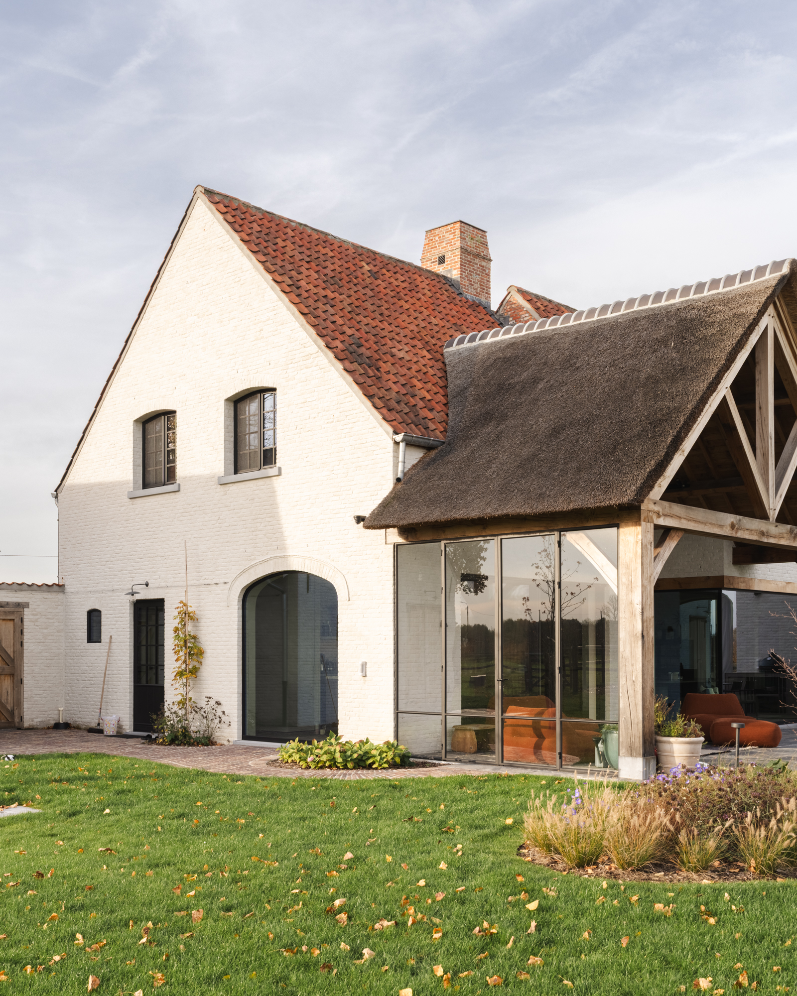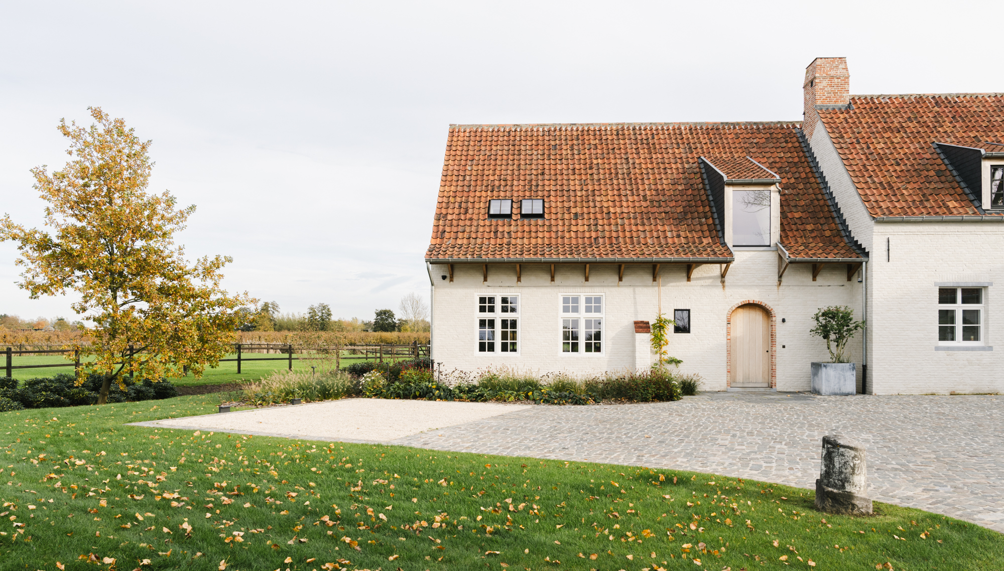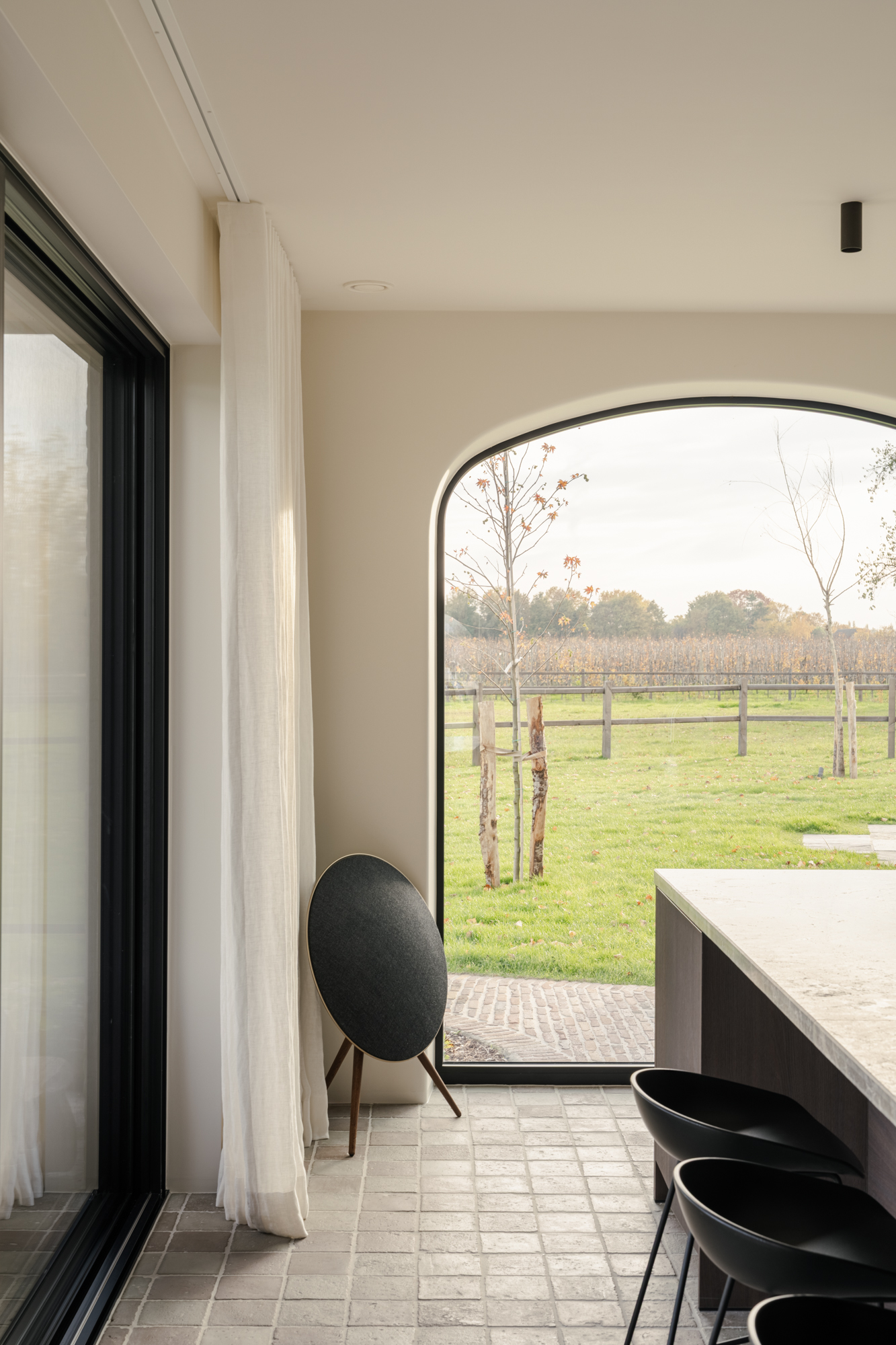 "De combinatie van materialen en kleuren geeft onze hoeve een unieke uitstraling. Voor de voorzijde kozen we bewust voor witte ramen met glasverdeling en een warme eiken deur om de authentieke sfeer te behouden. Achteraan genieten we volop van de grote raampartijen met een schuifraam en een prachtig boograam. Dankzij het zonwerende glas blijft het binnen heerlijk koel, terwijl we maximaal kunnen genieten van het uitzicht op de omliggende natuur."