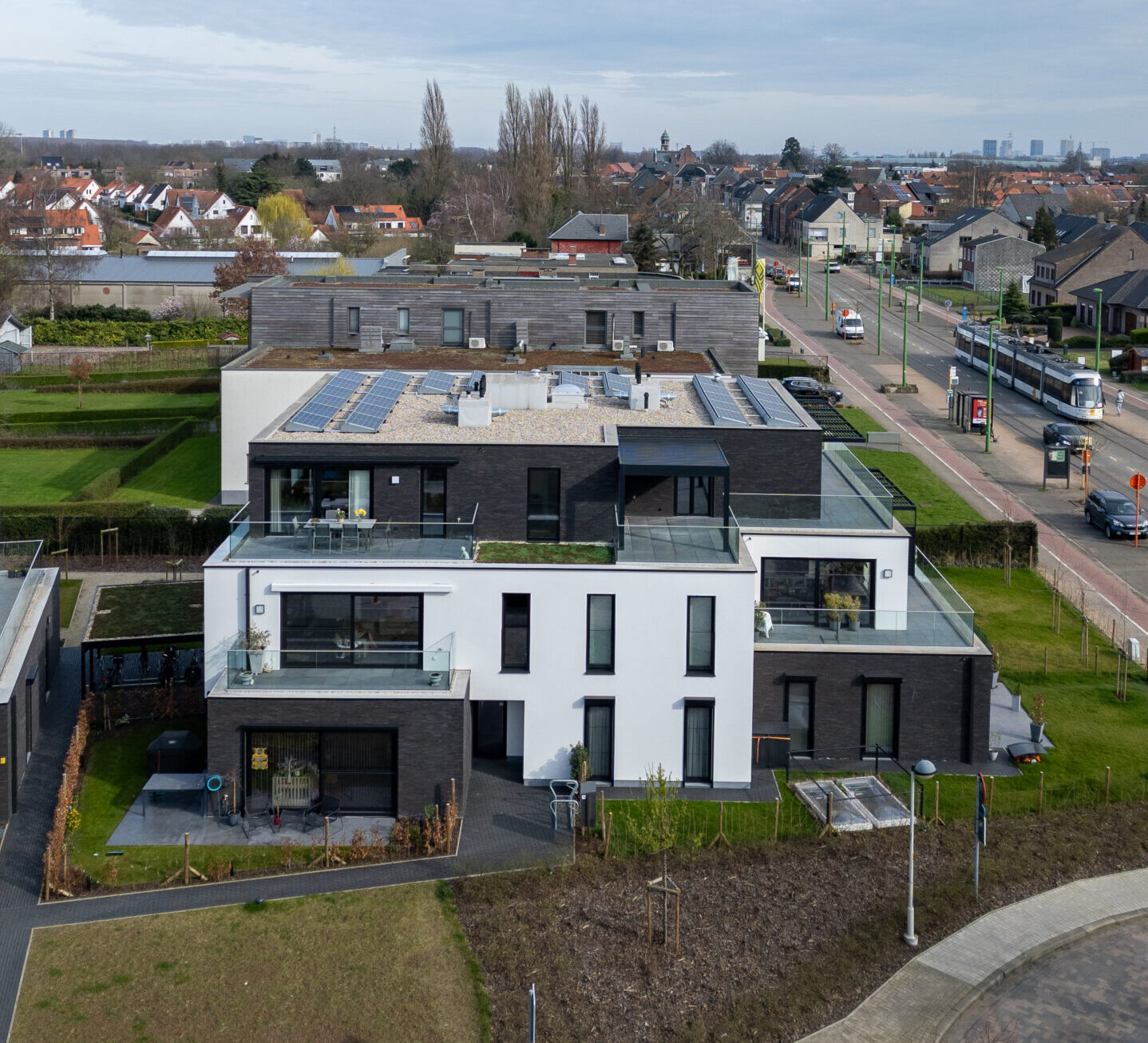 De zwarte Aluminium en PVC ramen zorgen voor een tijdloze en strakke uitstraling die perfect aansluiten bij de vorm en bouwstijl van het project.
